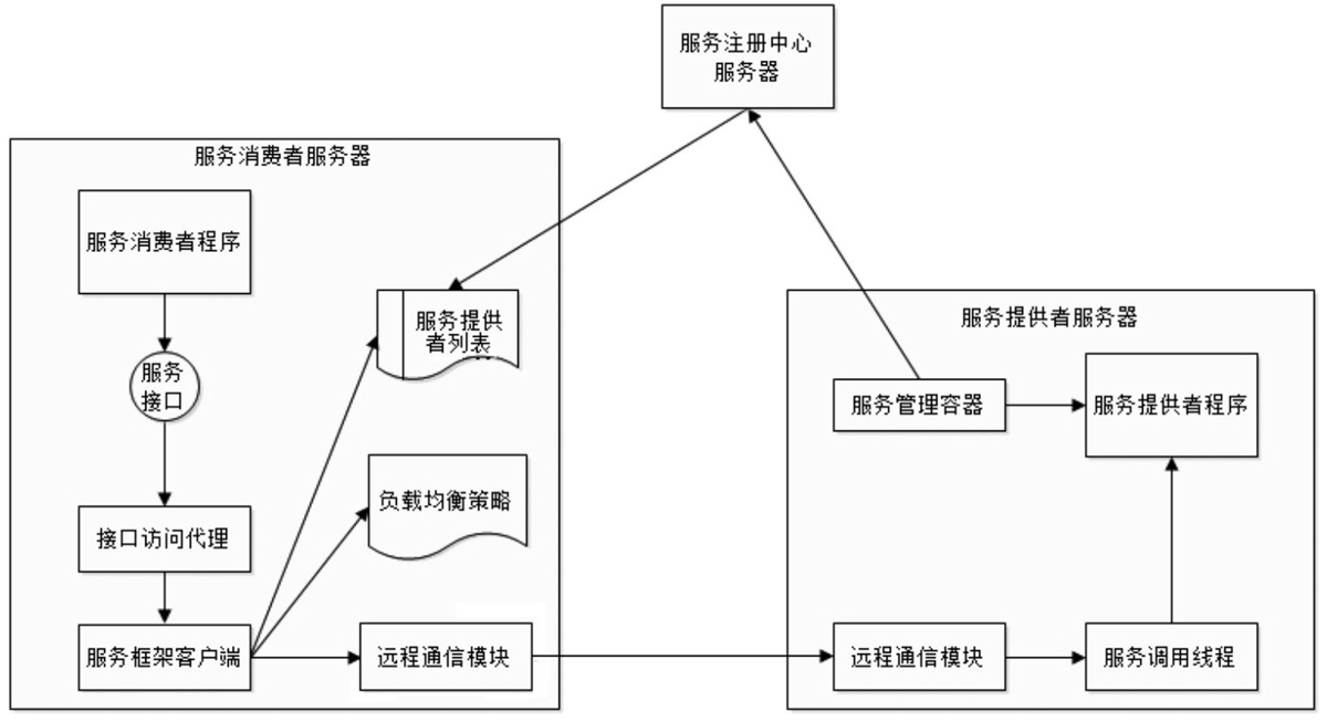 服务框架客户端模块通过服务注册中心加载服务提供者列表(服务提供者启动后自动向服务注册中心注册自己可提供的服务接口列表),查找需要的服务接口,并根据配置的负载均衡策略将服务调用请求发送到某台服务提供者服务器。如果服务调用失败,客户端模块会自动从服务提供者列表选择一个可提供同样服务的另一台服务器重新请求服务,实现服务的自动失效转移,保证服务高可用。