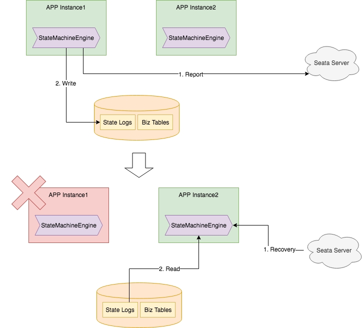 状态机引擎收到事务恢复请求后,从数据库里装载日志,并恢复状态机上下文继续执行;