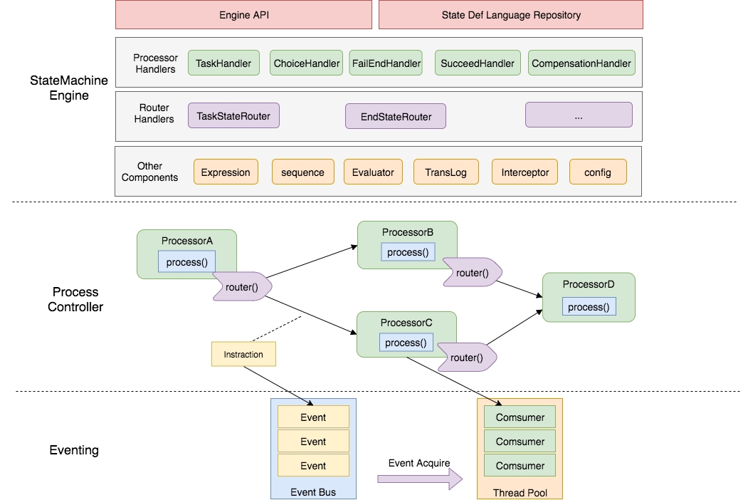"状态"的执行是基于事件驱动的模型,stateA 执行完成后,会产生路由消息放入 EventQueue,事件消费端从 EventQueue 取出消息,执行 stateB