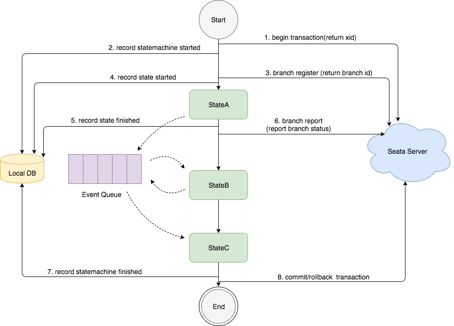 当整个状态机执行完成,会记录"状态机实例"执行完成事件到本地数据库,然后调用 Seata Server 提交或回滚分布式事务